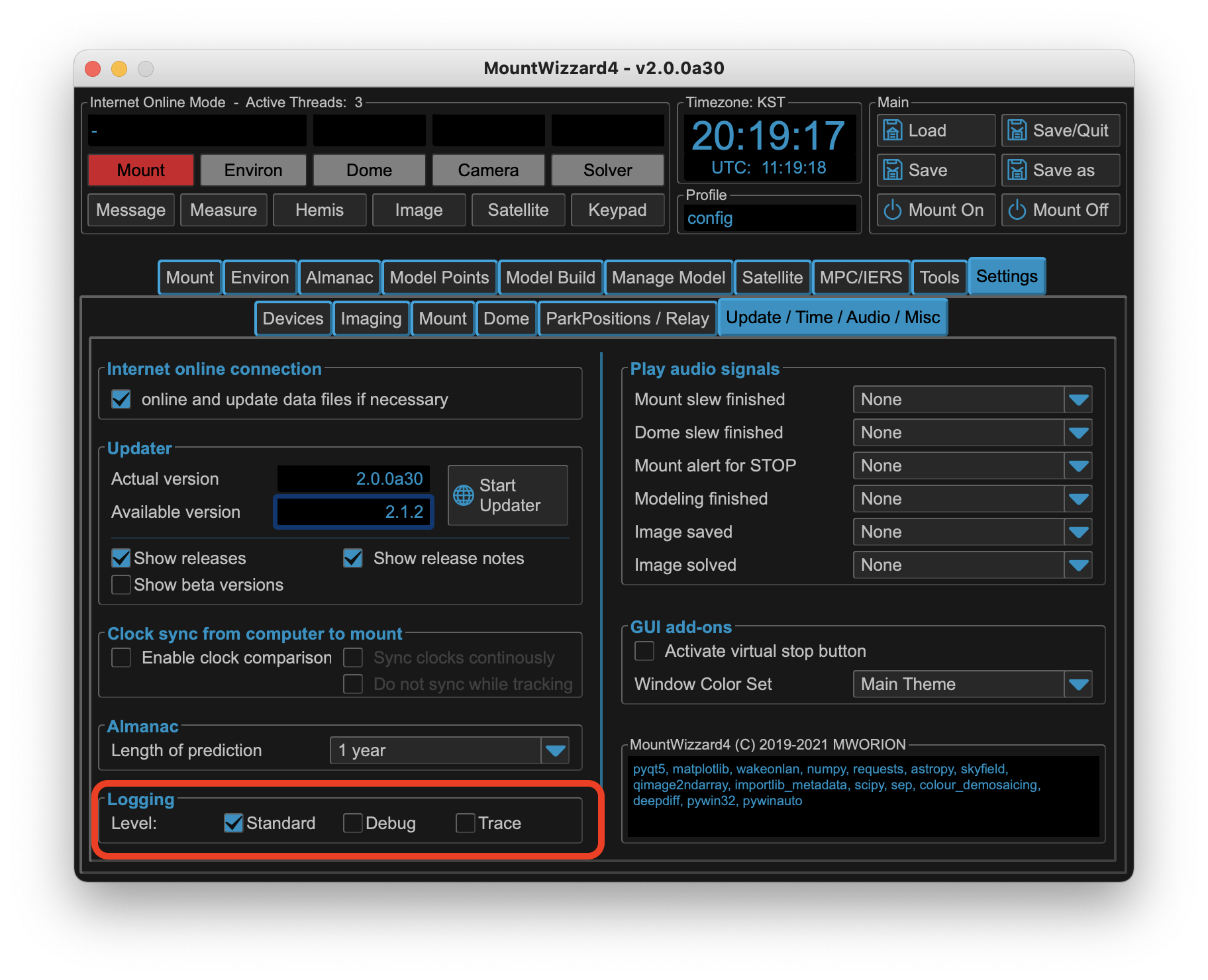 to update MountWizzard4 to the latest version. If you already have installed v3 of MountWizzard with uv, please do not use the internal update anymore. It will be removed in v4. UV handles the update / downgrade and the relations to python versions better the my (limited) attempt. As MountWizzard4 will follow newer libraries and therefore also python versions, you will have to update this in parallel in the old setup, but uv will manage this for you out of the box.